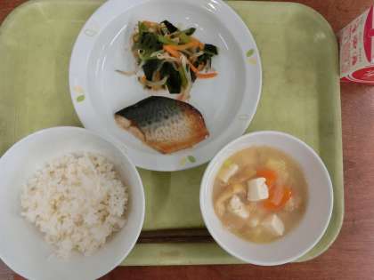 献立は「ごはん、魚の西京焼き、海藻と野菜の和え物、みそ汁、牛乳」です。
