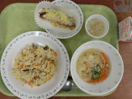 献立は「たなばたずし、白身魚のマヨネーズ焼き、七夕汁、りんごゼリー、牛乳」です。