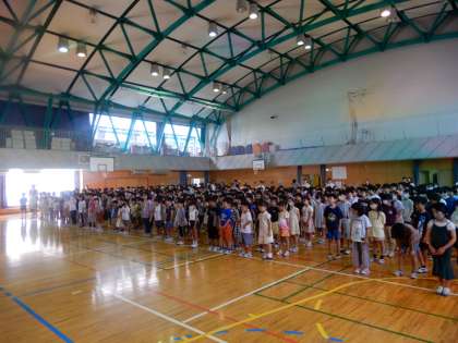 今日で1学期が終わります。校長からは、1学期を振り返りできるようになったことなどを、キャリアパスポートに記録することの話がありました。その後、5年児童代表の言葉、校歌斉唱、生活指導主任から夏休みの生活についての話、などがありました。暑い日が続いています。熱中症にならないように注意して過ごしましょう。