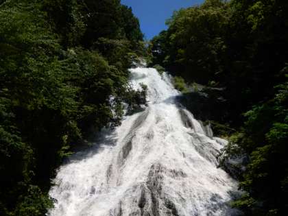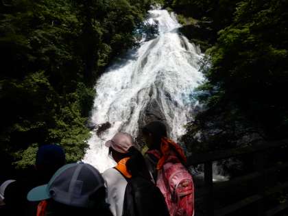 湯滝を見学。華厳の滝とは違った迫力があります。