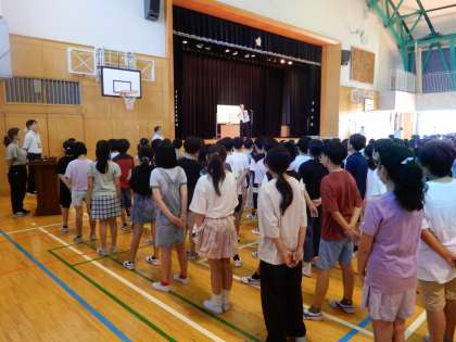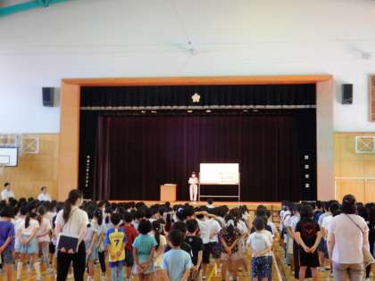 2学期の始業式を、体育館で行いました。全校児童の元気な笑顔に会うことができて、うれしいです。学校長からは、2学期の目標へ向けて取り組むことなどの話がありました。4年生代表児童の言葉、校歌斉唱で2学期がスタートしました。