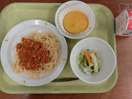 献立は「スパゲッティミートソース、ピクルス、キャロットケーキ、牛乳」です。