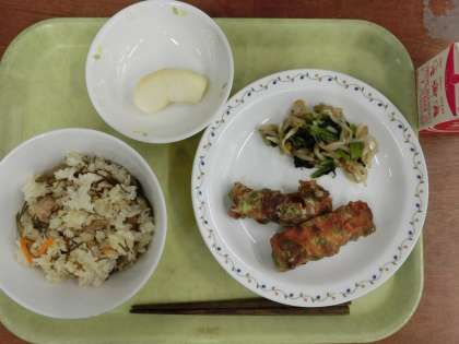 献立は「豚肉とごぼうのごはん、ちくわの磯辺揚げ、おひたし、りんご、牛乳」です。
