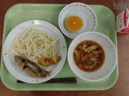 献立は「きつねつけうどん、ししゃものごまから揚げ、てんぷら(かぼちゃ)、菊花みかん、牛乳」です。
