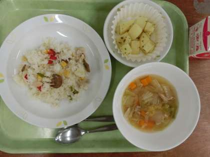 献立は「ピラフ、じゃがいものマヨネーズ焼き、野菜スープ、牛乳」です。