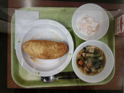 献立は「あげパン、春雨スープ、ピーチヨーグルト、牛乳」です。