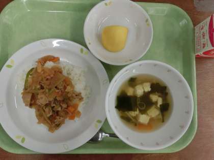 献立は「スタミナ丼、豆腐とわかめのスープ、柿、牛乳」です。