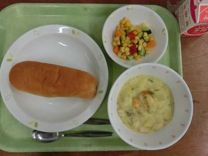 献立は「国産小麦コッペパン、パンプキンシチュー、トロピカルサラダ、牛乳」です。