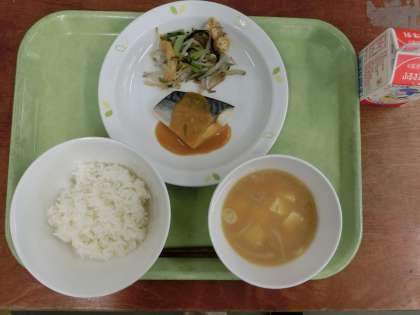献立は「ごはん、魚のピリ辛ソース、油揚げと野菜のひたし、みそ汁、牛乳」です。