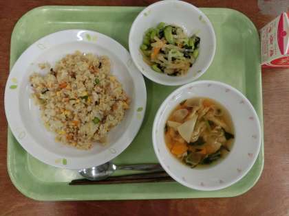 献立は「ツナそぼろごはん、枝豆入り大根とわかめのサラダ、吉野汁、牛乳」です。