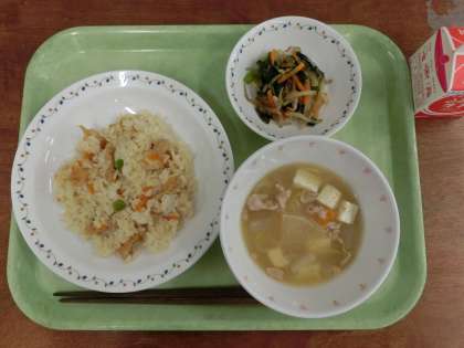 献立は「子ぎつねごはん、野菜のからしじょうゆかけ、豚汁、牛乳」です。