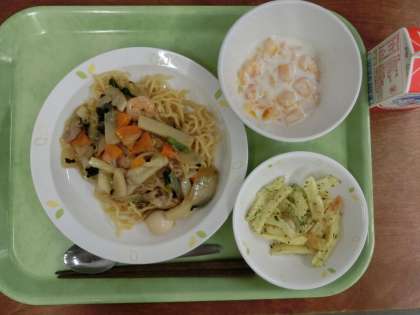 献立は「五目あんかけそば、フライドポテト、ピーチヨーグルト、牛乳」です。