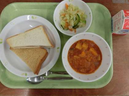 献立は「二色サンド、トマトシチュー、野菜のレモンサラダ、牛乳」です。