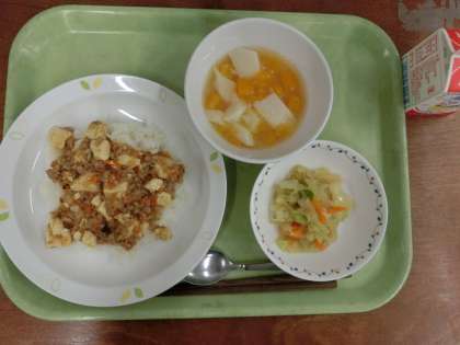 献立は「麻婆豆腐丼、中華サラダ、杏仁豆腐、牛乳」です。