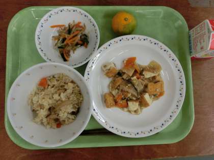 献立は「秋の香りごはん、生揚げとそぼろの煮物、おひたし、みかん、牛乳」です。