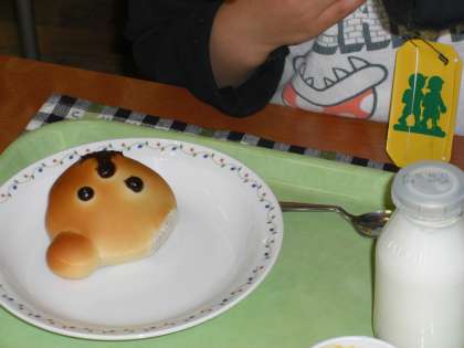 お友達と食べる給食は、格別です。「くまぱんの耳がおいしい」という声が聞こえてきました。これから毎日八幡山小学校のおいしい給食を食べます。