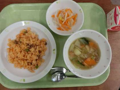 献立は「チキンライス、大根のサラダ、白いんげんの田舎風スープ、牛乳」です。