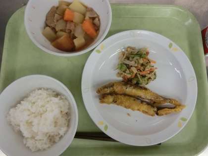 献立は「有機米ごはん、ししゃものカレー揚げ、野菜の乾物あえ、肉じゃがうま煮、牛乳」です。