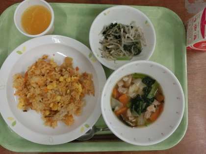 献立は「キムチチャーハン、ワンタンスープ、塩ナムル、キャロットゼリー、牛乳」です。