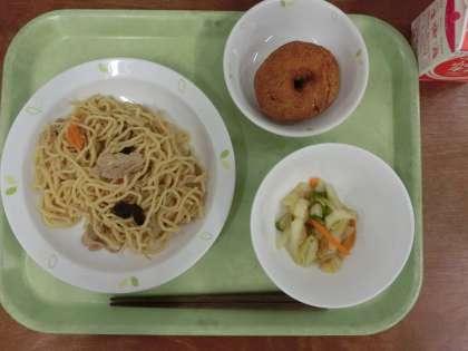 献立は「塩焼きそば、野菜の中華かけ、黒糖ごまドーナッツ、牛乳」です。