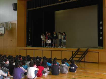 今日は、○×クイズ集会でした。1年生から6年生まで楽しむ中で学校のきまりなどがわかるクイズが出されました。クイズには、腕で大きく○や×を作って答えました。みんなで楽しくすごすひとときでした。