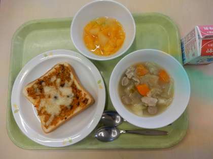 献立は「ミートチーズトースト、ポトフ、フルーツポンチ、牛乳」です。