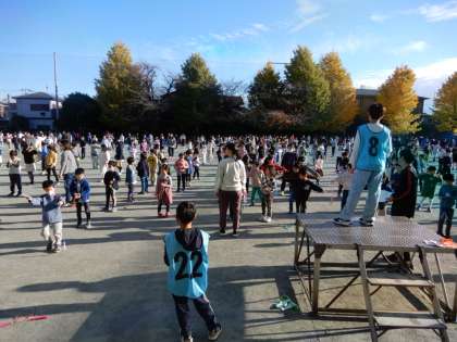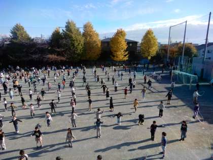 今朝、体育朝会がありました。全校のみんなで、短なわ跳びをしました。運動委員会の5、6年生のお手本を見てから跳びました。みんなとても元気です。