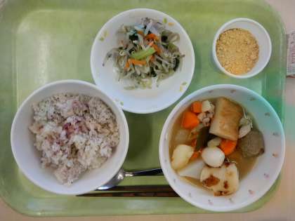 献立は「ゆかりごはん、変わりおでん、野菜のごま風味、黒糖寒天、牛乳」です。