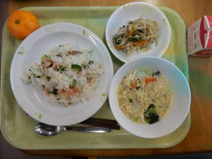今日の献立は「あけぼのずし、牛乳、卵雑煮、きのこ入りおひたし、みかん」です。