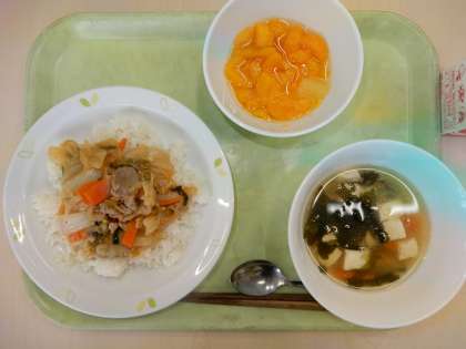 献立は「キムチ丼、牛乳、わかめスープ、フルーツポンチ」です。