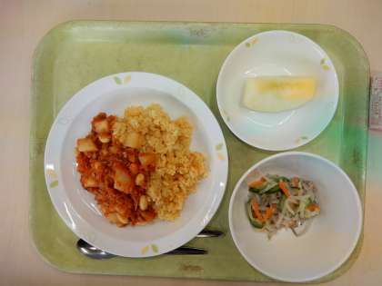 献立は「チリビーンズライス、牛乳、もやしとツナのサラダ、りんご」です。チリビーンズとは、テキサス州やニューメキシコ州など、アメリカ南西部で食べられているメキシコ風豆料理です。トマト味のピリ辛スープで豆を煮込みます。給食では、トマトピューレ、トマトジュース、ケチャップ、チリパウダーで味をつけています。これを、ごはんにかけて食べます。