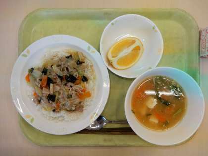 献立は「豚肉の中華丼、牛乳、中華風コーンスープ、はっさく」です。