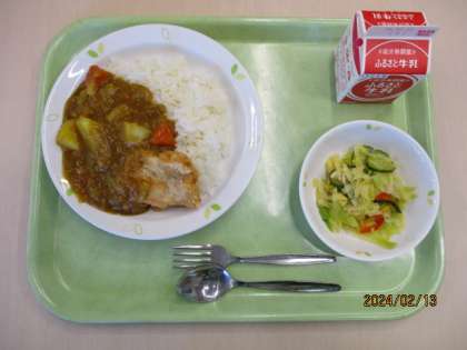 献立は「ごはん、牛乳、野菜カレー、米粉のチキンカツ、イタリアンサラダ」です。今日は、なかよしタイム給食がなくなり、ちょっと残念ですね。でも、みんなが食べられる食材を使っています。カレーは、鶏ガラと豚骨でスープをとり、肉を入れず野菜の旨味を利用してカレーを作りました。カレーのとろみは小麦粉ではなく、米粉を使用しています。じっくり煮込んでおいしく仕上がっています。カレーに肉を入れてしまうと、給食で肉をとる量が多くなって、「米粉のチキンカツ」がつけられなくなってしまいます。米粉のチキンカツは、パン粉を使ったカツと違いますが、味わって食べてください。