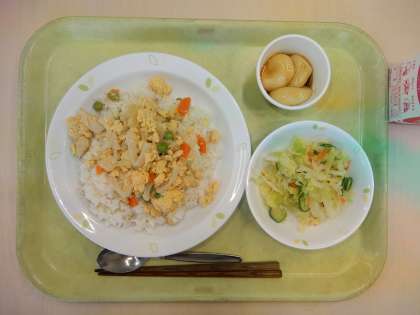 献立は「親子丼、牛乳、野菜のひとしお、白玉だんご」です。