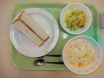 献立は「ジャムサンド、牛乳、コーンシチュー、キャベツのハニードレッシングかけ」です。