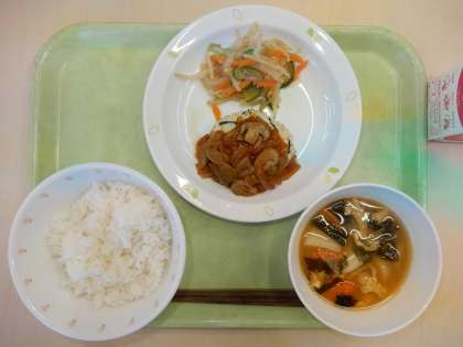 献立は「ごはん、牛乳、豆腐入りハンバーグ、こんにゃくサラダ、味噌汁」です。