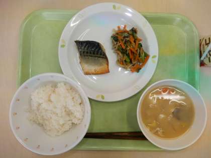 献立は「ごはん、コーヒー牛乳、魚の一味焼き、おひたし(青菜)、さつま汁」です。
