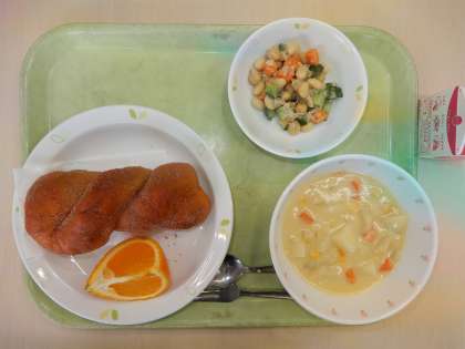 献立は「揚げパン(ココア味)、牛乳、鶏肉のクリームスープ、ビーンズサラダ、スイートスプリング」です。