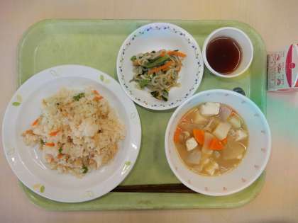 献立は「子ぎつねごはん、牛乳、野菜のからしじょうゆかけ、豚汁、ぶどうゼリー」です。