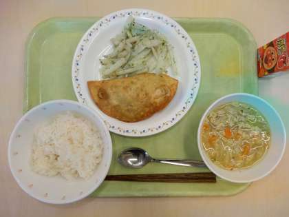 献立は「ご飯、ジャンボ餃子、ポテト、ABCスープ、りんごジュース」です。