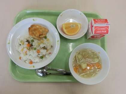 献立は、三食ピラフ、鶏肉のカレー焼き、ヌードルと野菜のスープ、甘夏、牛乳です。