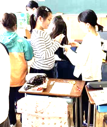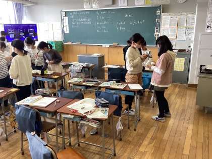 自分の名前と好きなものを描いた名刺を作り、今まで学習してきた表現を使って、友達と名刺交換をしました。