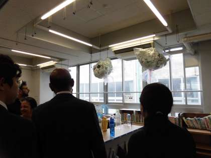写真中 3年2組のてるてる坊主についての説明を受けています。