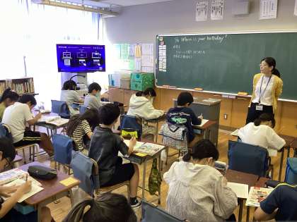5月14日(火)4校時、5年3組では英語の学習をしました。今日から新しい単元「When is your birthday?」に入りました。アニメーションを見て単語を理解し、子供たちは生き生きと発音していました。
