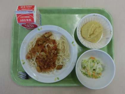 献立は、スパゲティー地中海ソース、キャベツサラダ、黒糖入り蒸しパン、牛乳です。