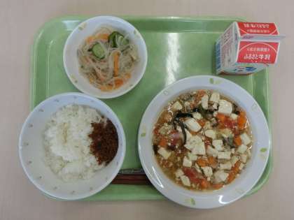 献立は、ごはん、かつおでんぶ、西湖豆腐、春雨サラダ、牛乳です。