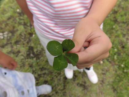 生活科園で四つ葉のクローバーを見つけた子がいました。いいことがありそうです。