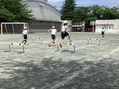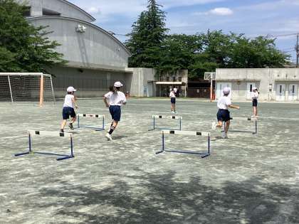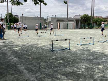 5月22日(水)2校時、5年3組の子供たちが校庭でハードル走の学習をしました。自分に合ったインターバルを見付け、第1ハードルまでの跳び方や跳ぶ際のリズムをつかみました。学習の後半には、タイムを計測しました。子供たちの一生懸命に走る姿、とてもかっこいいです。