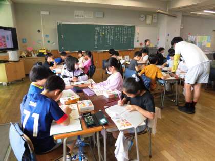 教科書の絵の中の言葉(漢字)を使って文を作ります。写真は作った文を班の友達に伝えているところです。授業の最後には様子がよく伝わる、詳しい文が作れました。