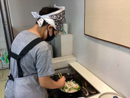 油のはねに気をつけながら野菜を炒めます。
